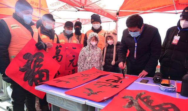 1月15日,在常泰长江大桥建设现场,书法爱好者为中交二航局建桥工人书写春联和福字。