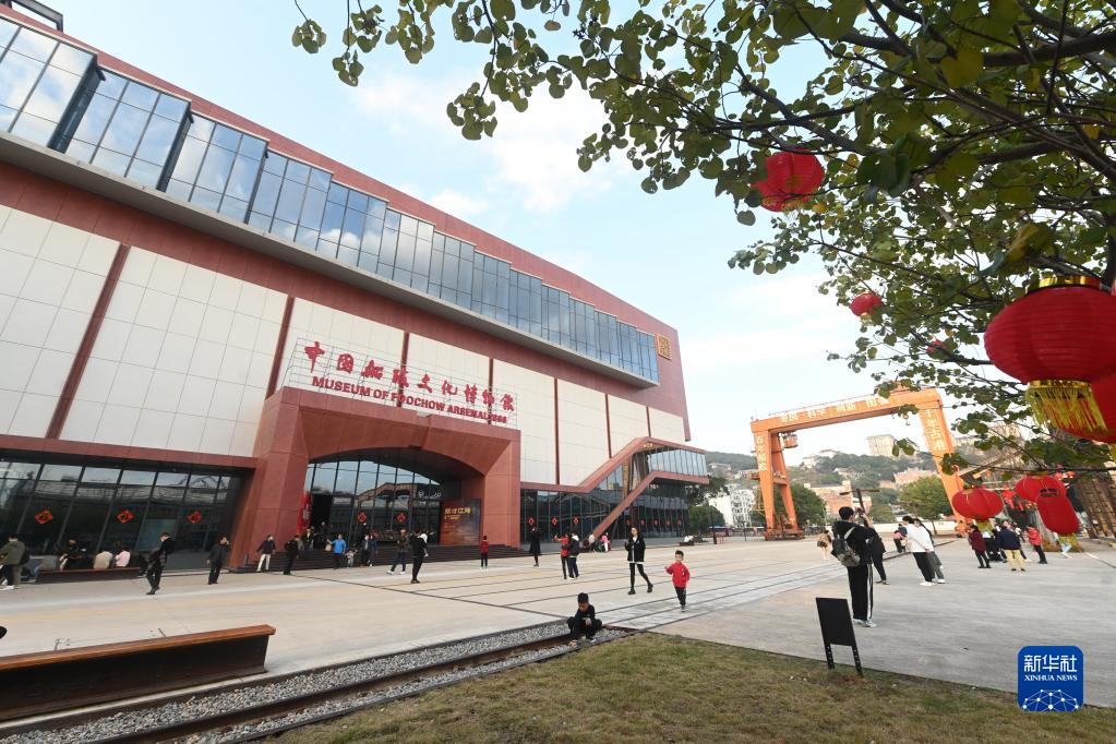 2月12日,游客在中国船政文化城核心区内的中国船政文化博物馆前游玩。