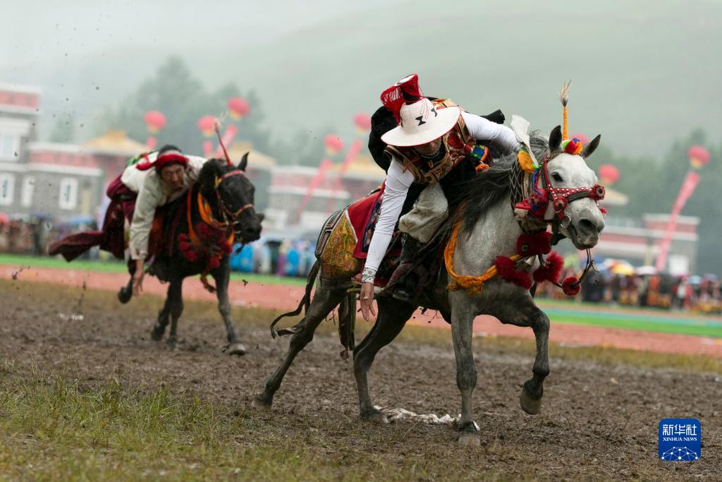 7月25日在玉树赛马场拍摄的跑马拾哈达表演。