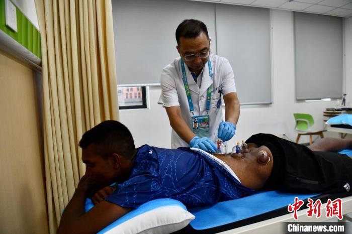 7月31日,来自斯里兰卡代表团的跳高运动员达森在大运村医疗中心康复医学科接受中医拔罐诊疗。 中新社记者 张浪 摄
