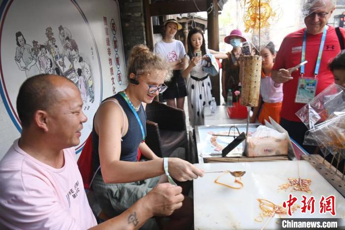 8月4日,意大利队游泳运动员拉昆塔纳·索尼娅(LAQUINTANA Sonia)(左二)在东门市井体验糖画。 中新社记者张浪 摄