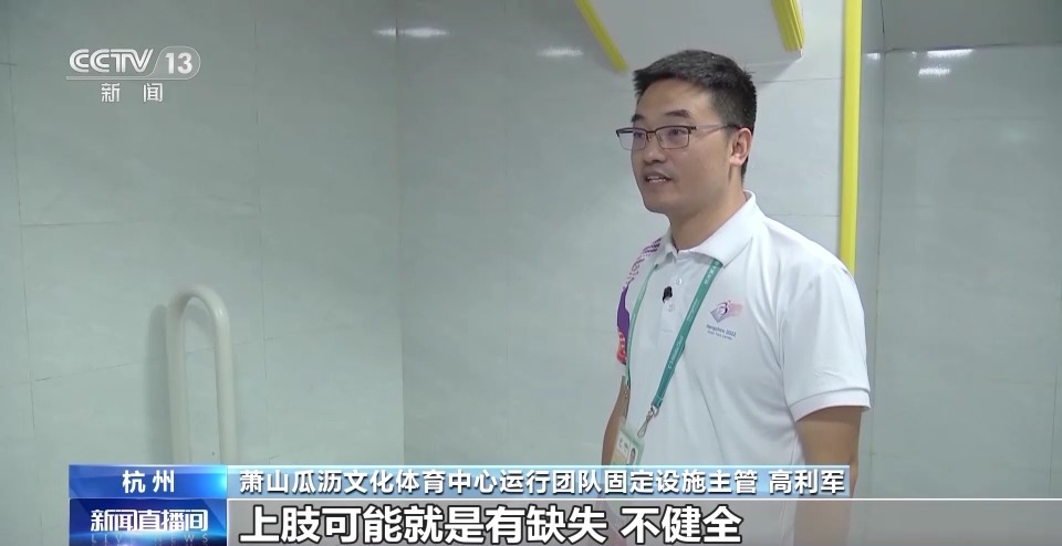萧山瓜沥文化体育中心运行团队固定设施主管高利军:很多跆拳道运动员下肢是健全的,上肢有些缺失或者不健全,没有办法使用普通马桶的按钮,所以我们特地为运动员设计了一个小小的凸起,运动员可以通过手肘来按压凸起按钮,达到上完厕所以后冲洗的功能。