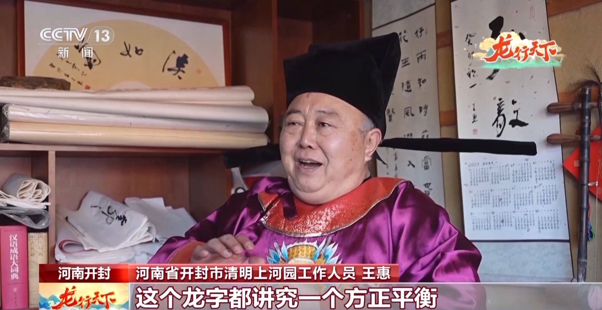 河南省开封市清明上河园工作人员王惠:在书法中,不管是用什么方式写,这个龙字都讲究一个方正平衡。我觉得龙就是正义的化身。
