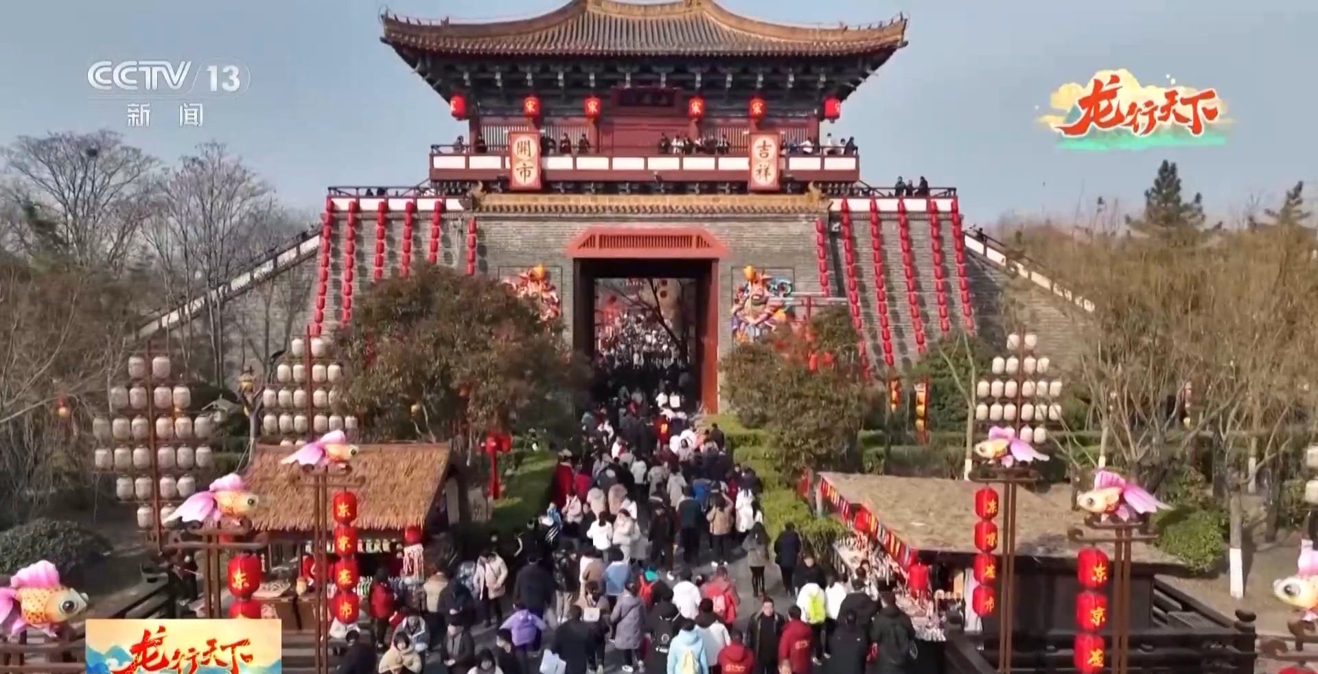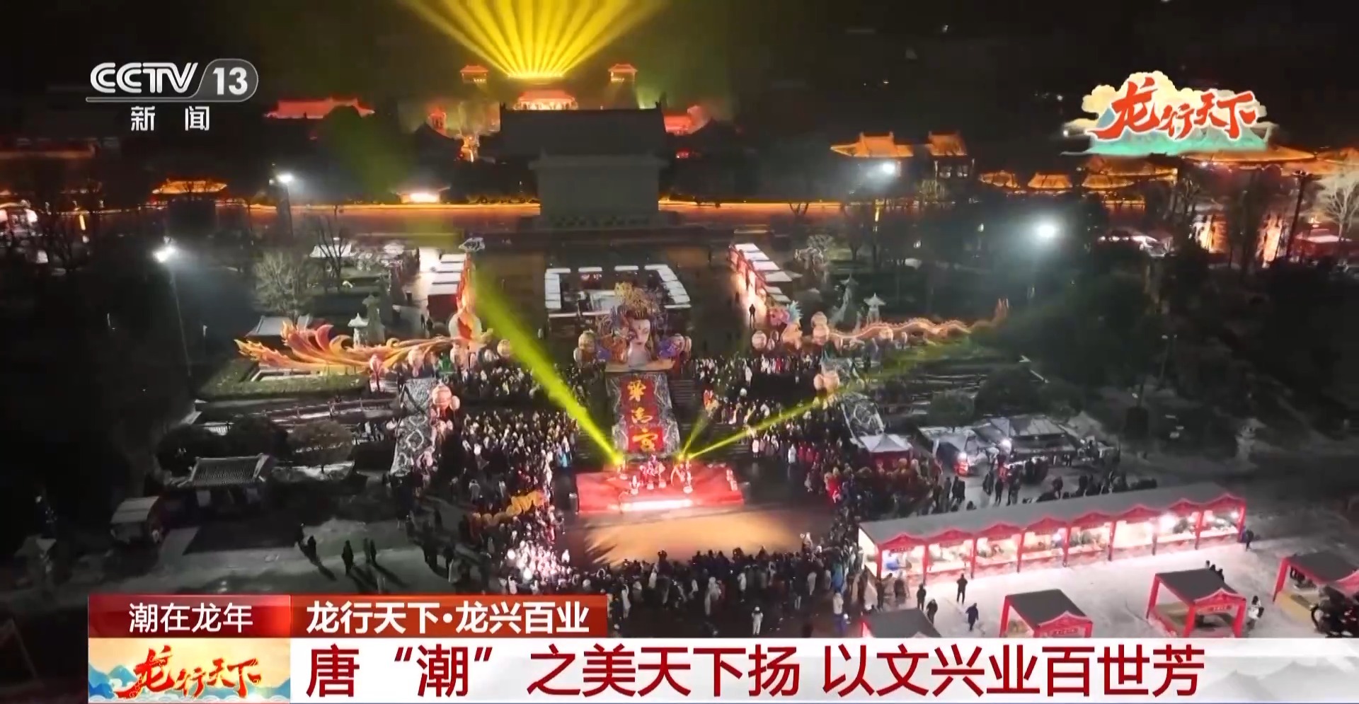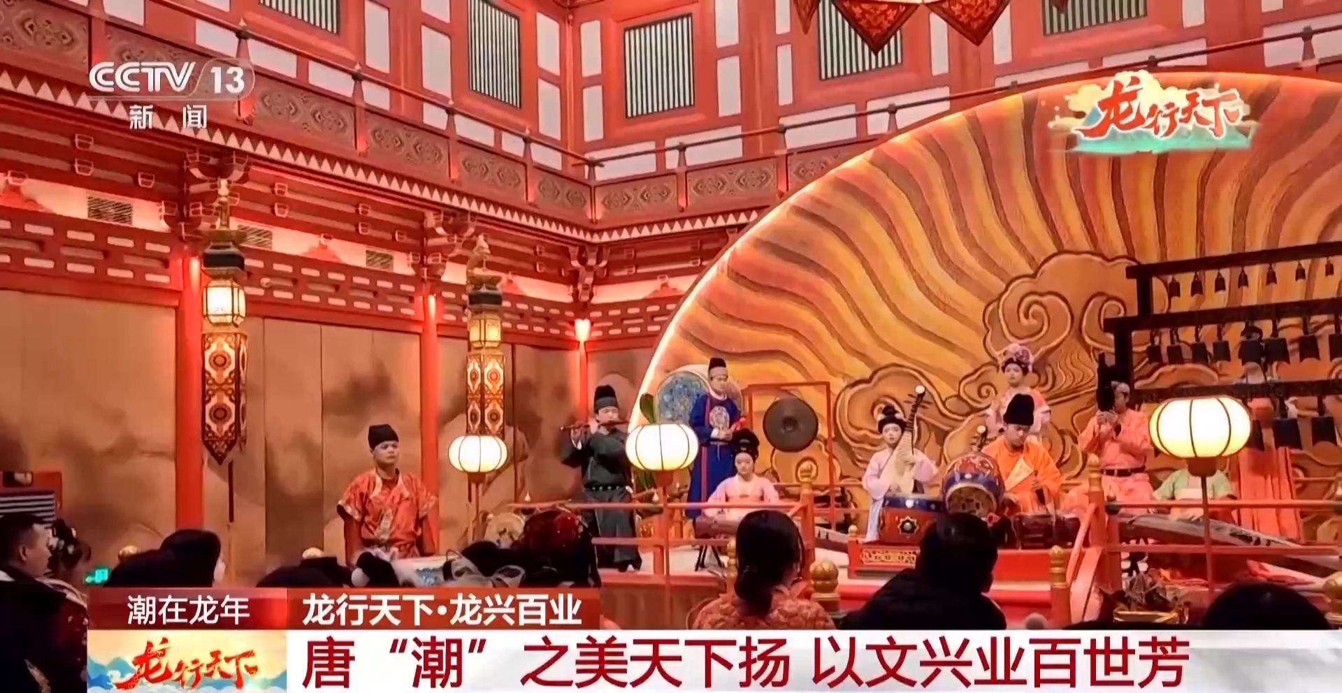 西安鼓乐鸣,音自大唐来。身着圆领袍服的乐师,与高髻罗裙的仕女,击座鼓、吹笙笛、敲云锣、响编钟,共同演奏《大唐燕乐》。“红山玉龙”“赤金走龙”等37条中华龙齐聚在古城墙之上,化身为各种灵动飘逸的创意花灯,上元唐宫灯会把古城西安的新春佳节,装点得格外喜庆热闹。