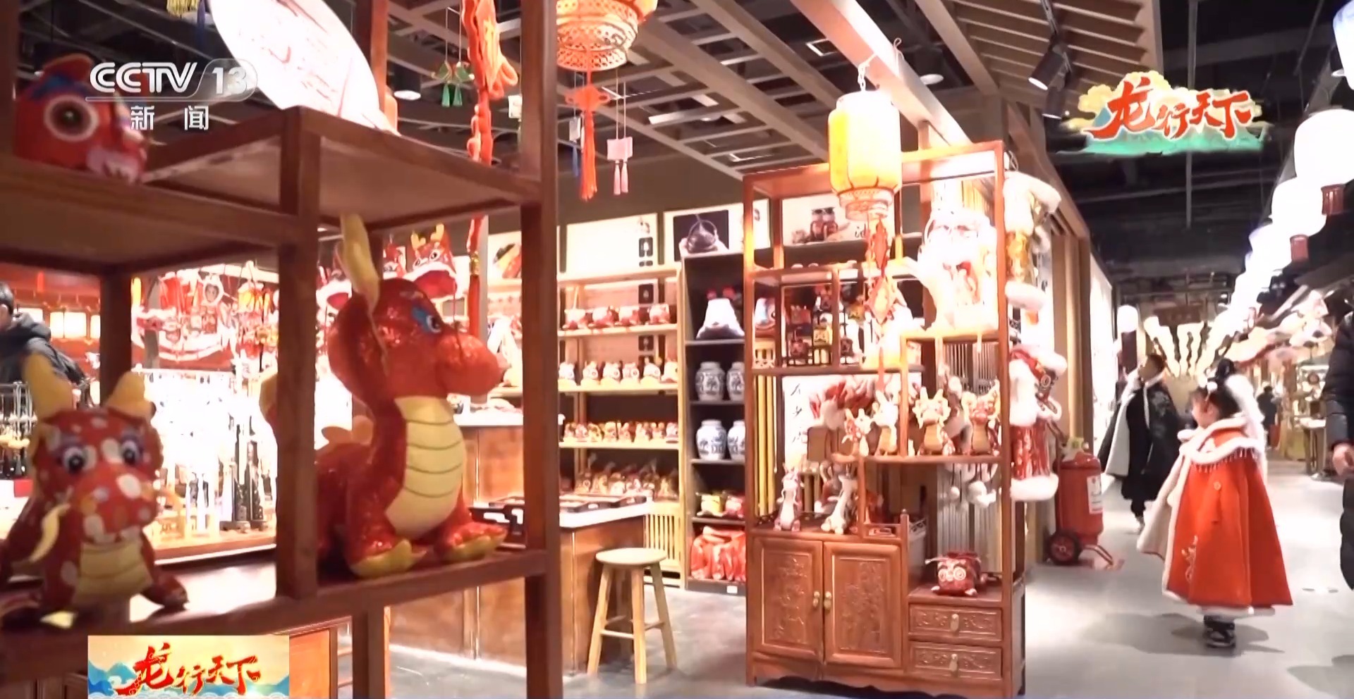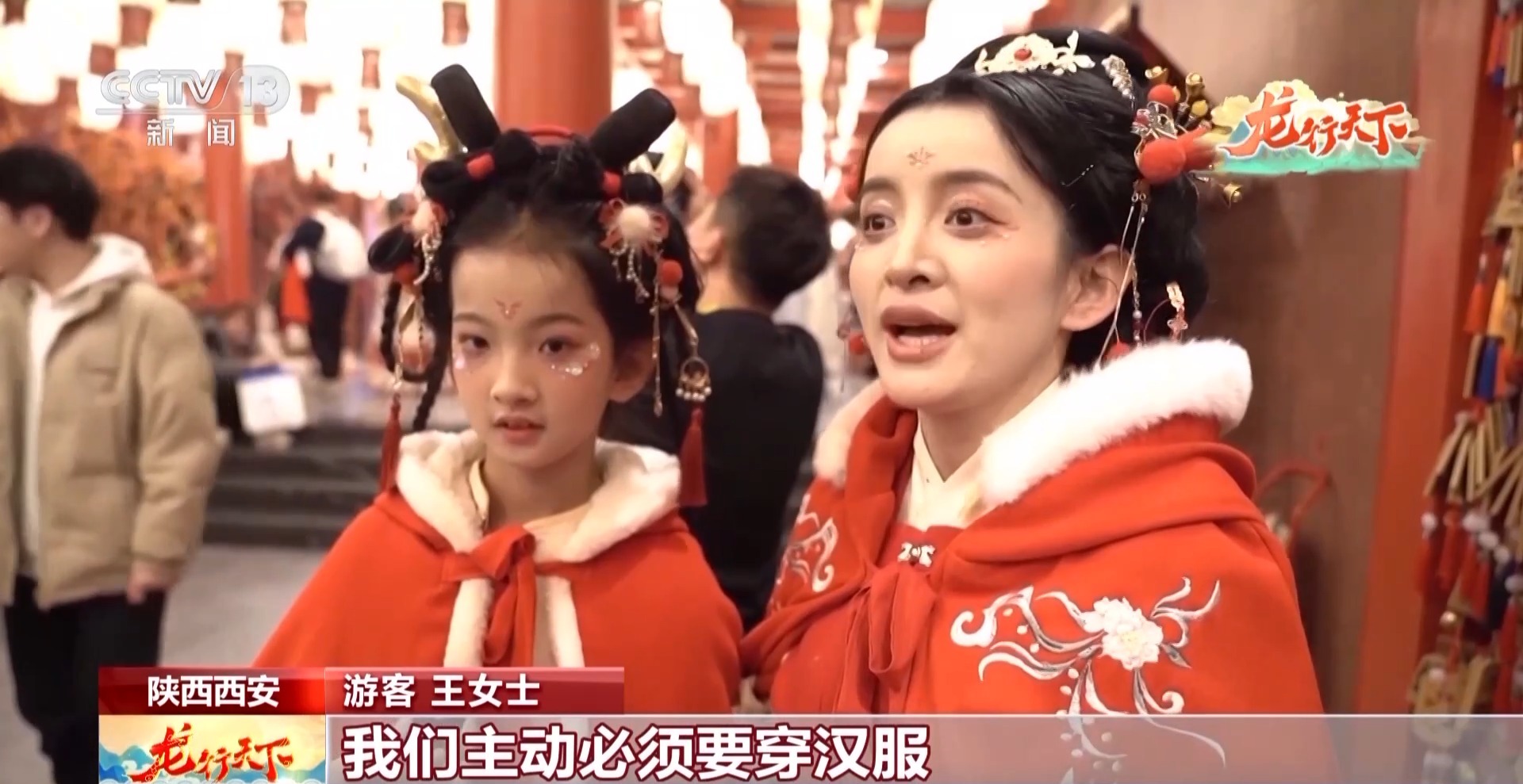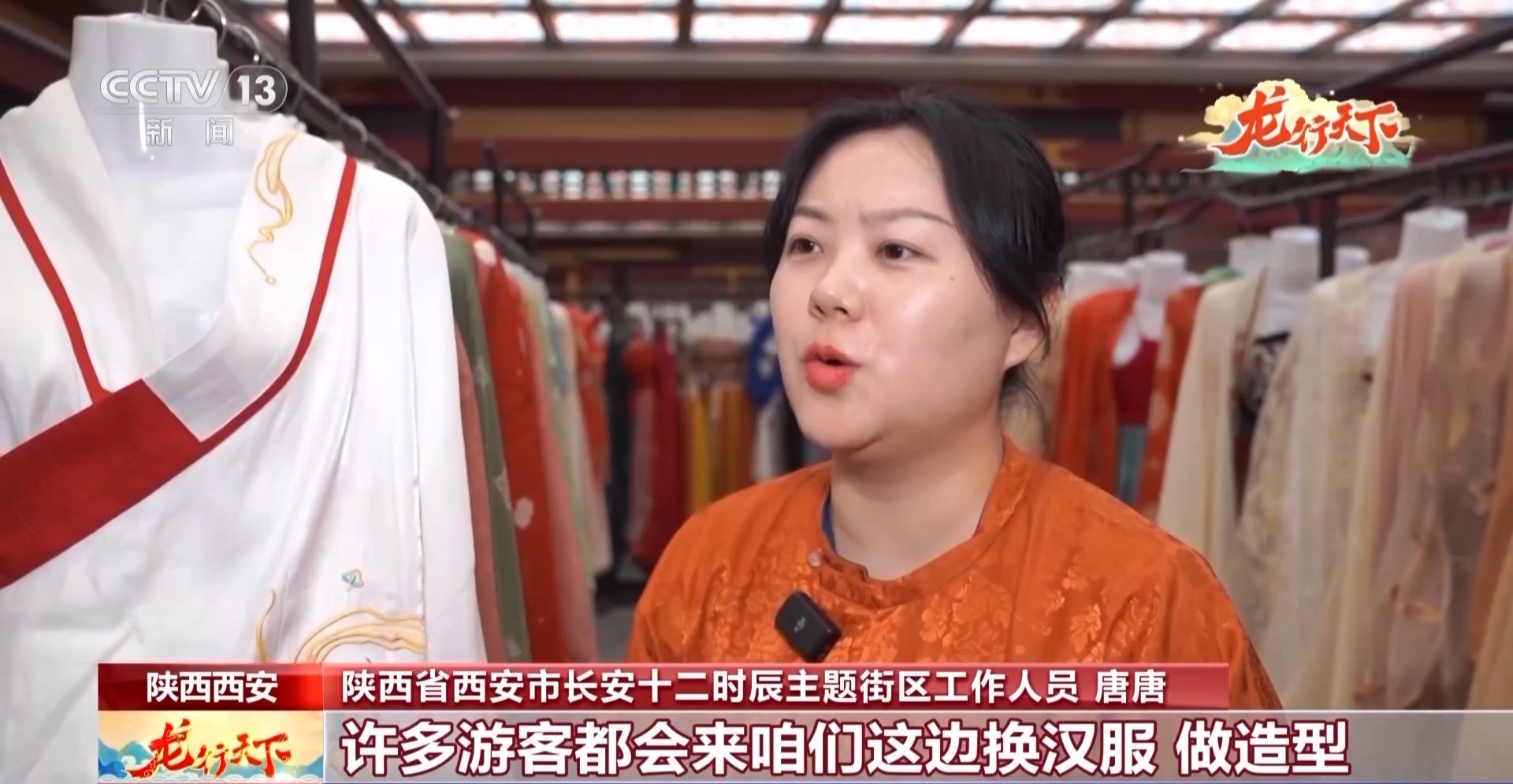 陕西省西安市长安十二时辰主题街区工作人员唐唐:进入街区前,许多游客都会来咱们这边换汉服、做造型,获得一个更好的沉浸式体验。在春节,我们这边有60个妆台从早到晚都是满的。尤其像今年春节,像这个有龙纹图案的衣服就是最抢手。