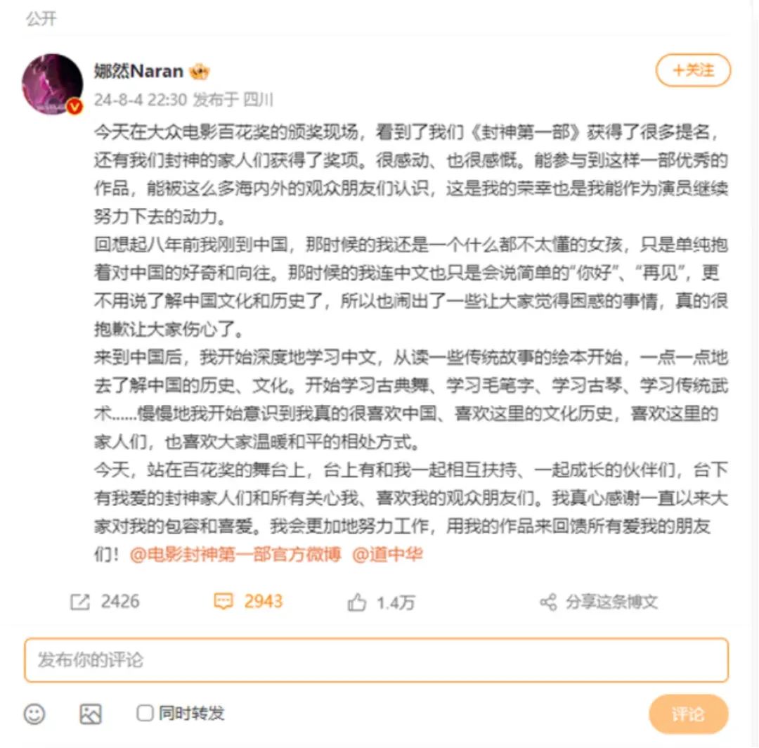 乌尔善:随着电影的上映,我们的新人演员也逐渐被人熟知。新人演员娜然是俄罗斯籍,她加入剧组后努力学习中文、中华礼仪、中国舞,为观众呈现一个灵动鲜活的妲己。但是她之前因为缺少中国历史文化的了解,6年前在海外社交媒体上转发了一篇内容不当的贴文,引起了网友的批评,她本人也有深刻的反思。很多外籍人士,他们本身是非常喜爱中国文化的,这其中也有一个逐步认识、了解中国历史和文化的过程。前几天,《封神一》获得百花奖后,娜然在微博上分享了自己对中华文化从陌生到认识,再到了解、喜爱的过程。对于新人,尤其是外籍演员,如果能给他们一个学习、了解、认识中华文化和中国历史的过程,我相信,会有更多的人愿意传播中华文化。