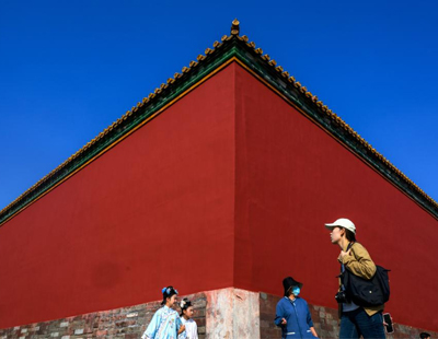8月19日,游客在福建晋江梧林村红砖古厝前拍照。