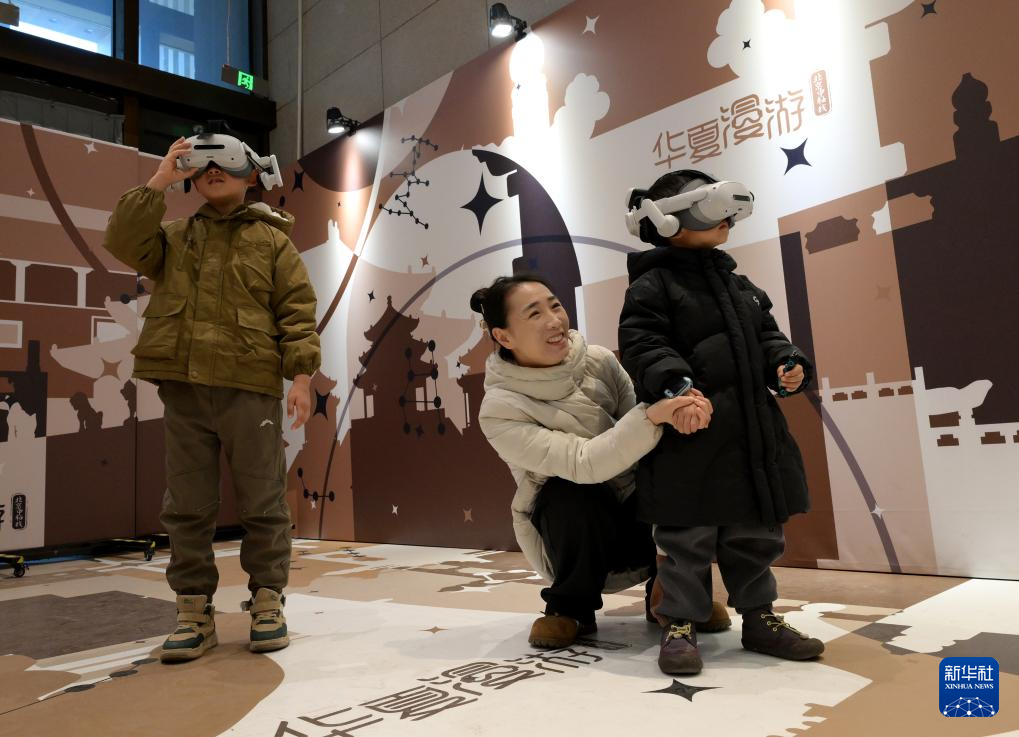 1月3日,小观众在中国考古博物馆“华夏漫游”互动项目区使用VR设备观看北京中轴线场景介绍。