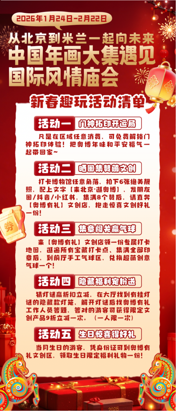 2026年1月24日至2月22日,北京奥运博物馆推出“从北京到米兰一起向未来——中国年画大集 遇见国际风情庙会”活动,活动包含“冰雪冬奥意韵由你——从北京到米兰”冬奥嘉年华、“赏年画·过大年”中国年画大集、国际风情庙会三场子活动,首次打破场馆界限,与正在开放的第十五届鸟巢欢乐冰雪季相联动!