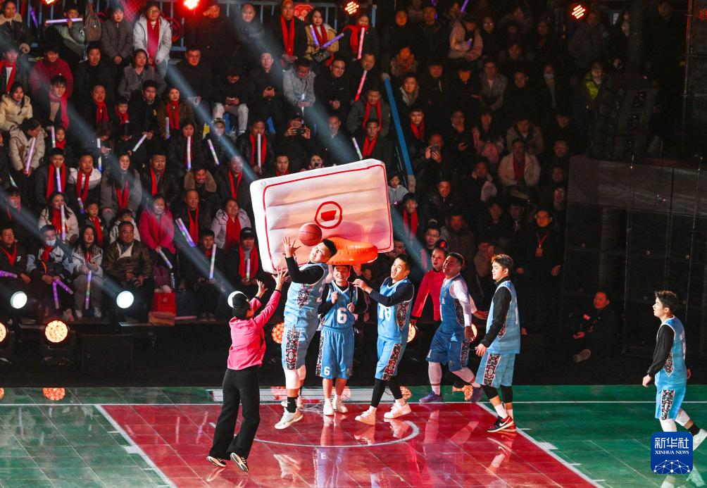 2月3日,人们在2026贵州“村晚”现场展示“姑妈”篮球。