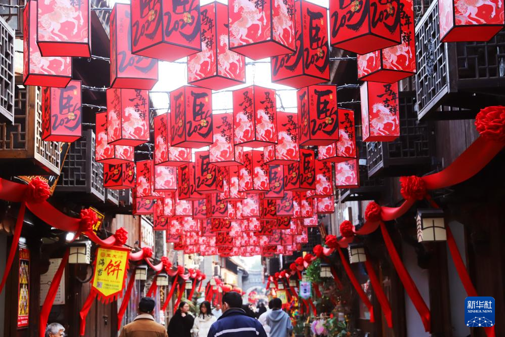 2月11日,市民游人走在挂满彩灯的浙江省台州市路桥区十里长街。