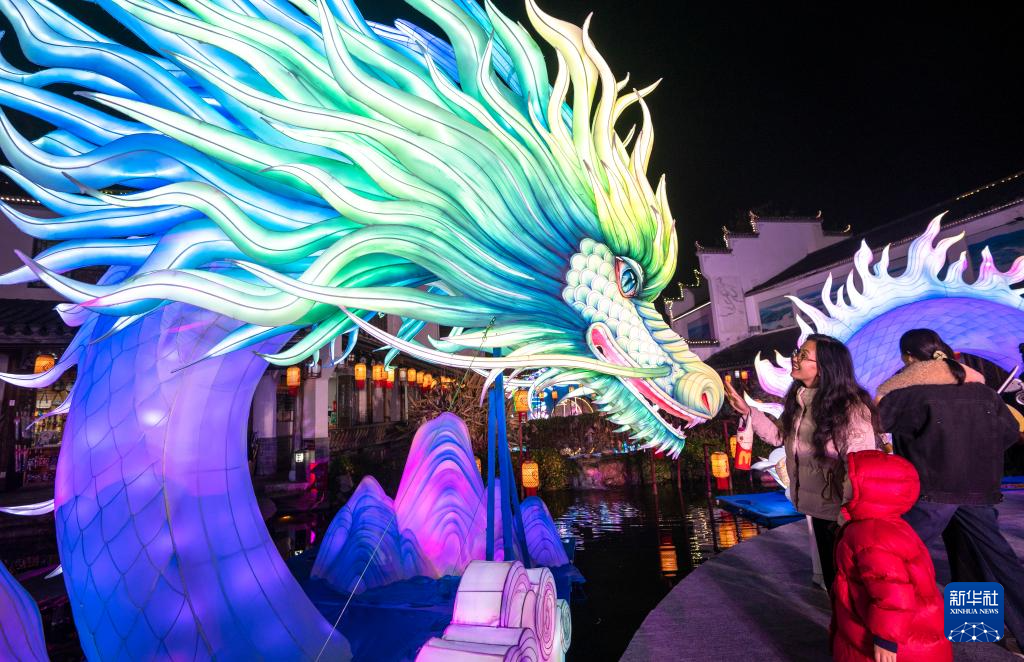 2月11日,市民和游客在四川省泸州市江阳区大梯步文化广场赏灯游玩。