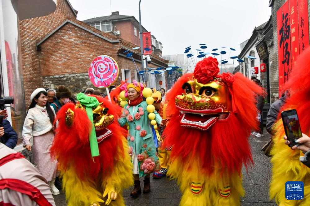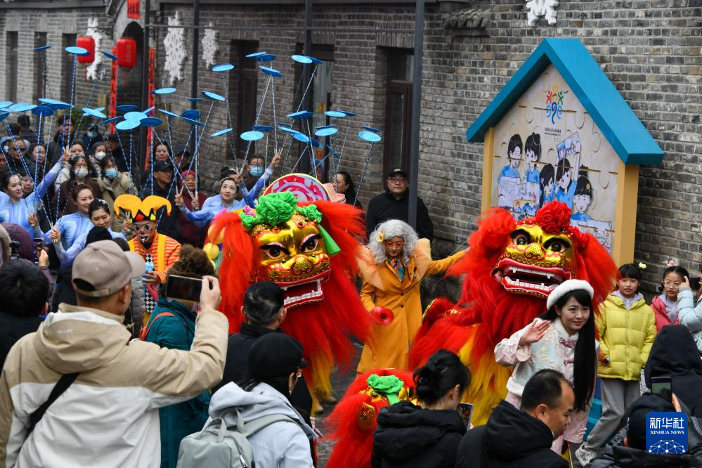 3月3日,济南市在上新街举行庆元宵演艺活动。这是人们在观看舞狮表演。