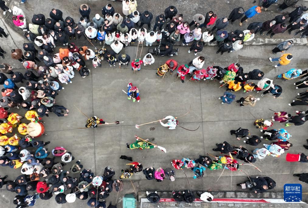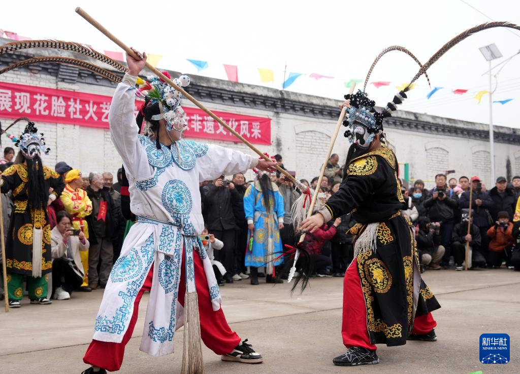 3月3日,民俗艺人在河北省井陉县小作镇桃林坪村为群众表演桃林坪花脸社火。