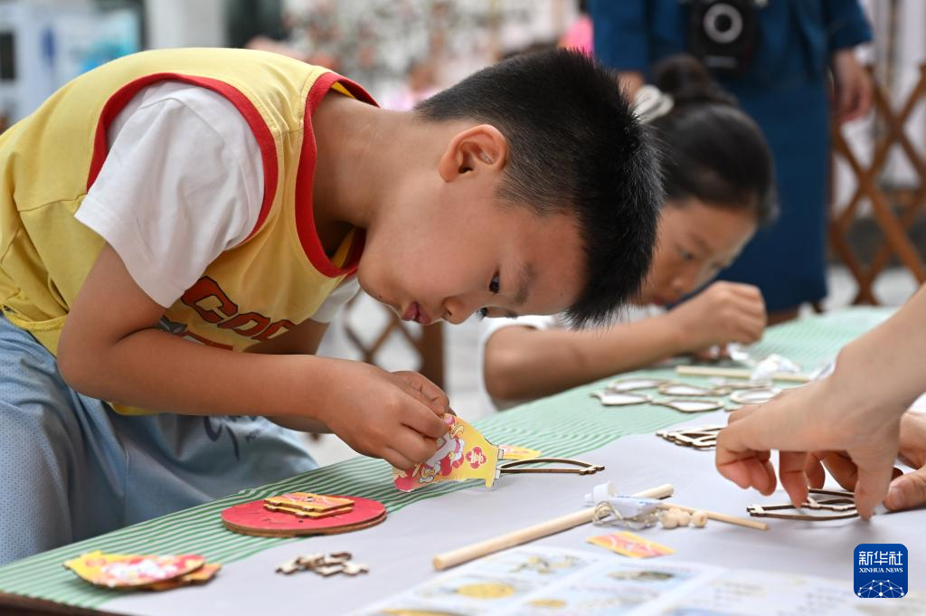 3月3日,小朋友在海南省博物馆庆元宵传统民俗社教活动中制作花灯。
