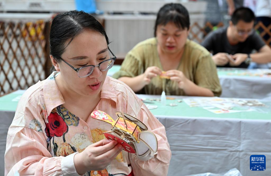 3月3日,游客在海南省博物馆庆元宵传统民俗社教活动中制作花灯。