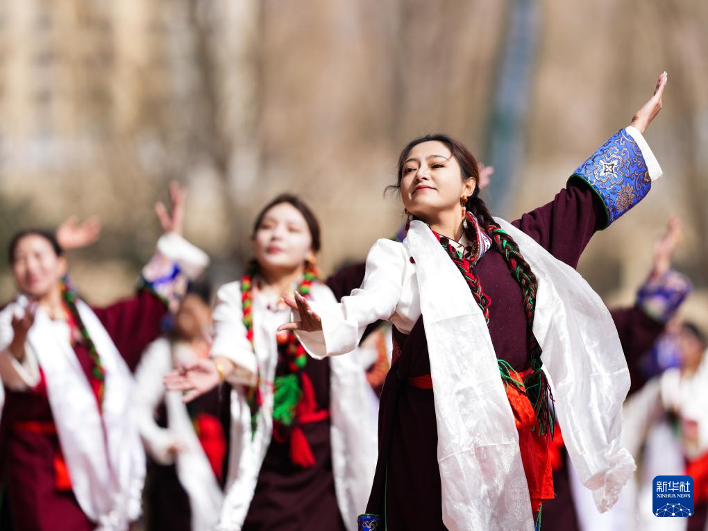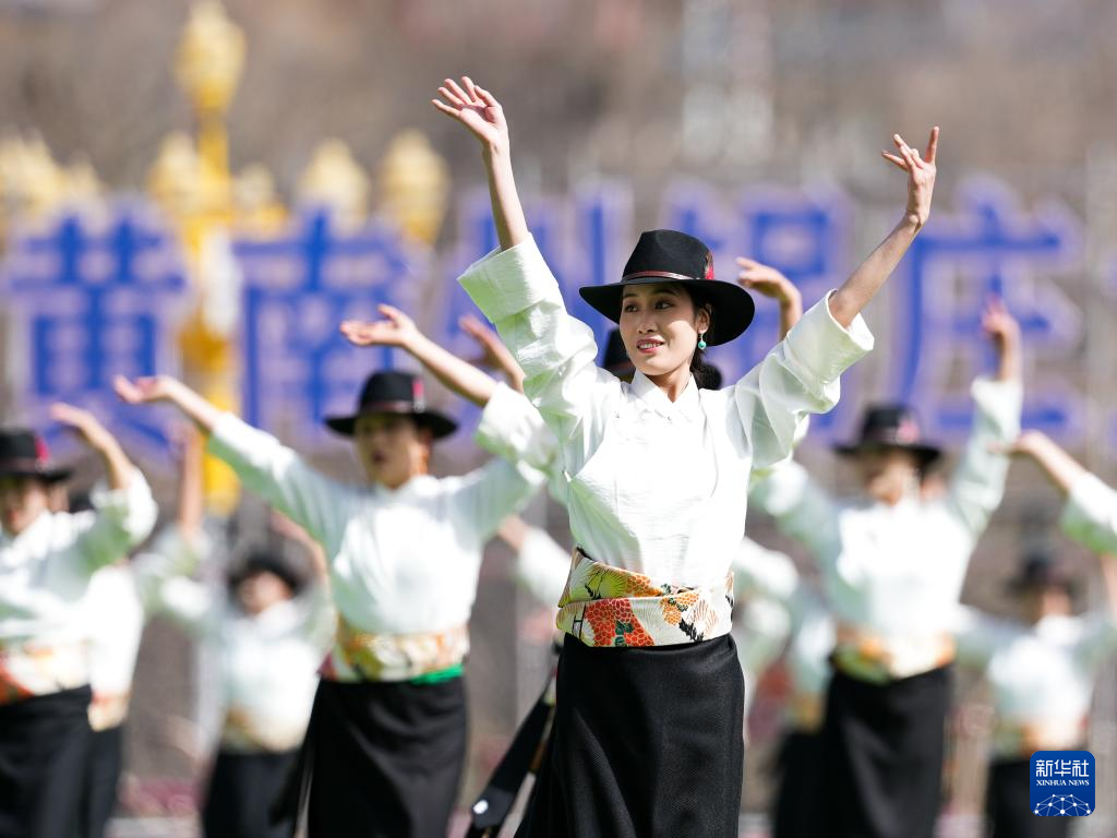 3月3日,演员在青海省黄南藏族自治州举行的锅庄展演活动中表演。