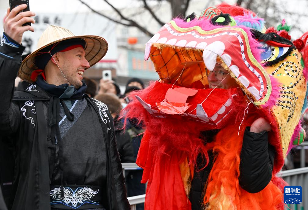 3月3日,以“文润庭州·乐享元宵”为主题的新疆昌吉市非遗社火展演活动在昌吉市启幕,为各族群众送上节日祝福。这是外国友人参与社火表演。