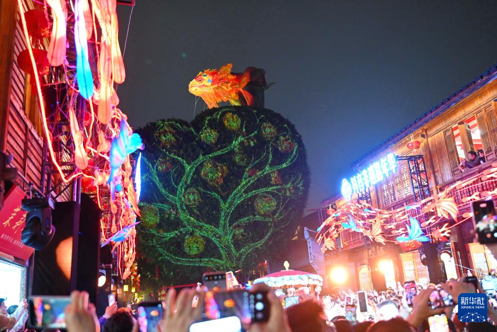 3月3日,福州三坊七巷南后街的爱心树上的投影秀和空中漂浮的“福鱼”吸引了众多市民游客拍照。