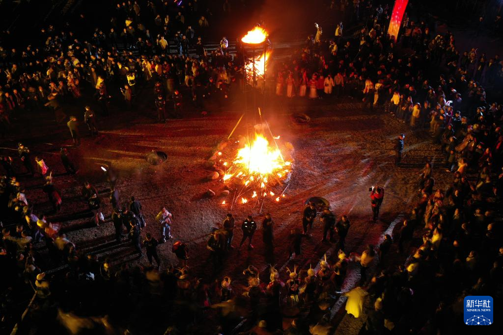 这是3月3日在甘肃省陇南市文县铁楼藏族乡草河坝村拍摄的《吉祥的火把》主题演绎现场(无人机照片)。