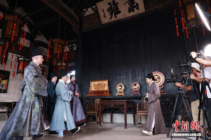 2025年8月24日,在浙江金华东阳卢宅景区,国际友人穿古装戏服,背台词、走机位……本次活动是2025“相聚浙里”国际人文交流活动的系列活动,邀请部分外国博主和友好使者参与以东阳木雕为主题的微短剧拍摄。 胡扬辉摄