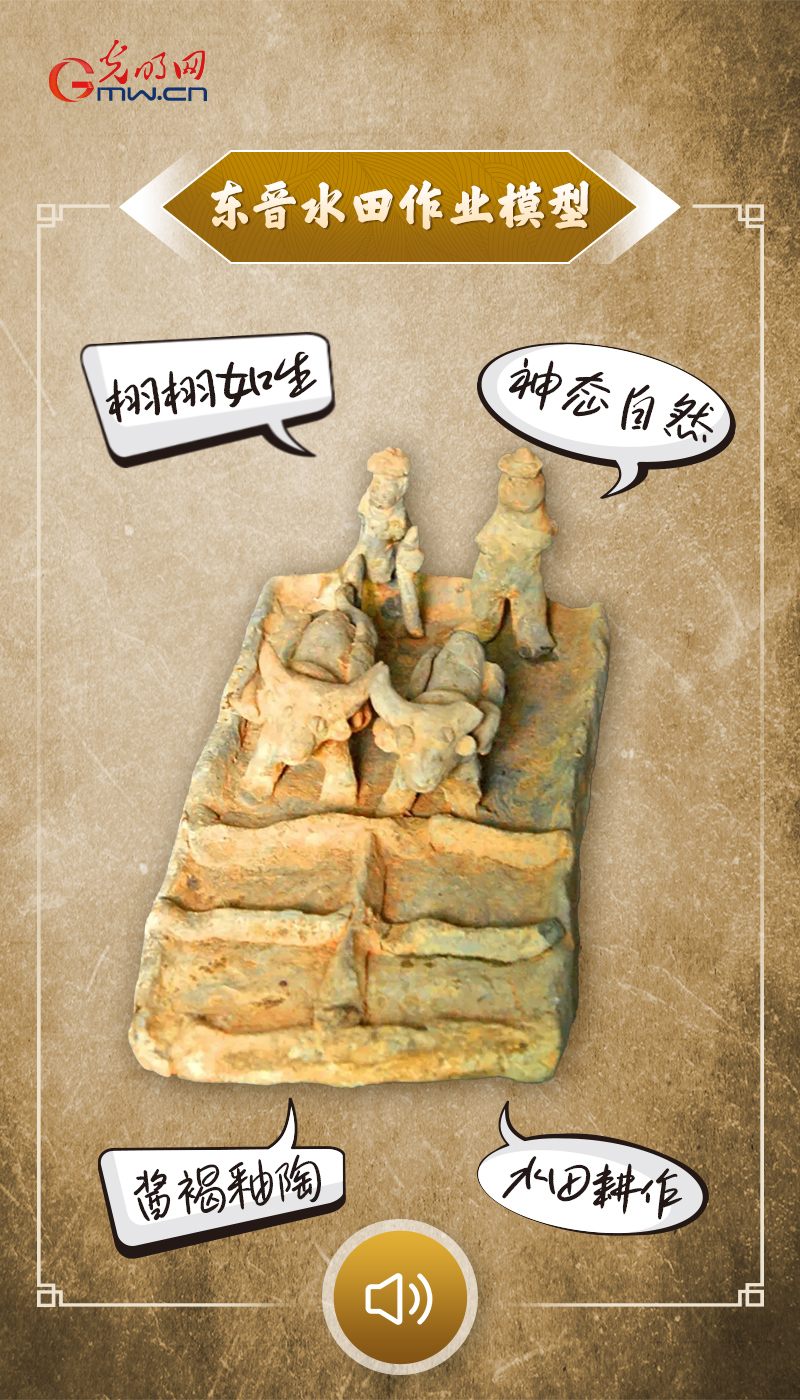 “我凝聚着东晋的农耕智慧,1989年于韶关北江中学重见天日。酱褐釉陶的身躯里,藏着古人顺天时、量地利的自然哲思,田埂分野的水田里,一牛一人循着春时耕作,不违农时、顺应天地,脱离了原始耕作的粗犷,以精耕细作的姿态融于自然。我是千年前岭南人与自然和谐共生的见证,听,那犁耙划过田泥的声响,还在诉说着顺应自然时节的农耕故事。”
