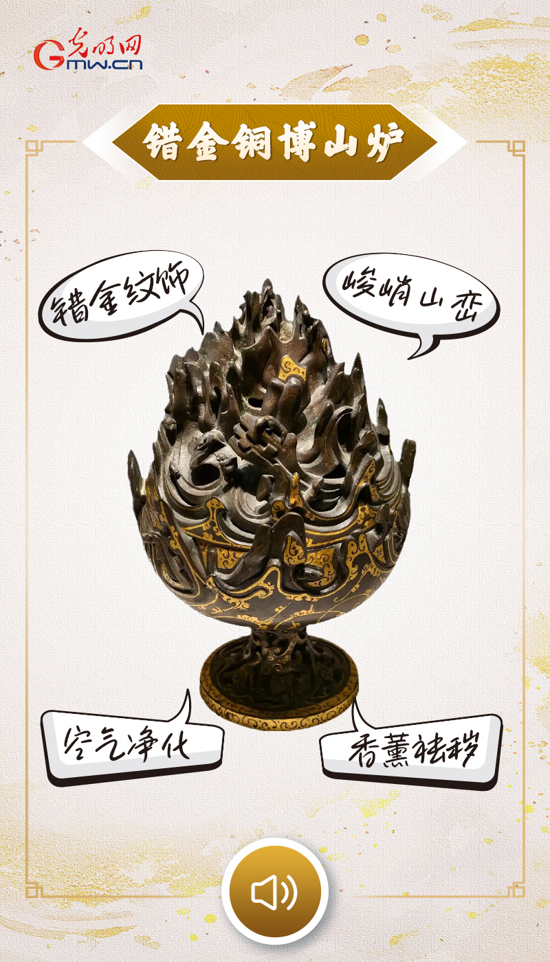 “我是西汉错金铜博山炉,诞生于大汉盛世,我以青铜为胎,通体饰以精美错金云气纹,炉盖雕琢成层峦叠嶂的博山仙山之形,山间藏有人物走兽,尽显汉代工匠的高超技艺与非凡创造力。当馨香燃起,袅袅青烟自山峦间缭绕升腾,既能驱秽除浊、净化空气,守护古人居家安宁,又可安神怡情、涵养身心,传递着平安祥和的美好祈愿。我以袅袅炉香与千年炉韵,生动诠释着汉代人居安全与健康养生的生活之道。”
