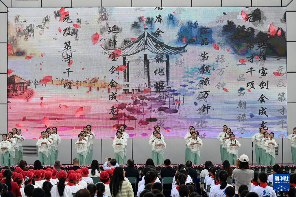 4月23日,湖北省武汉市未来实验小学美林校区学生在“书香润童心 经典伴成长”活动中表演《竹板诵书香》节目。