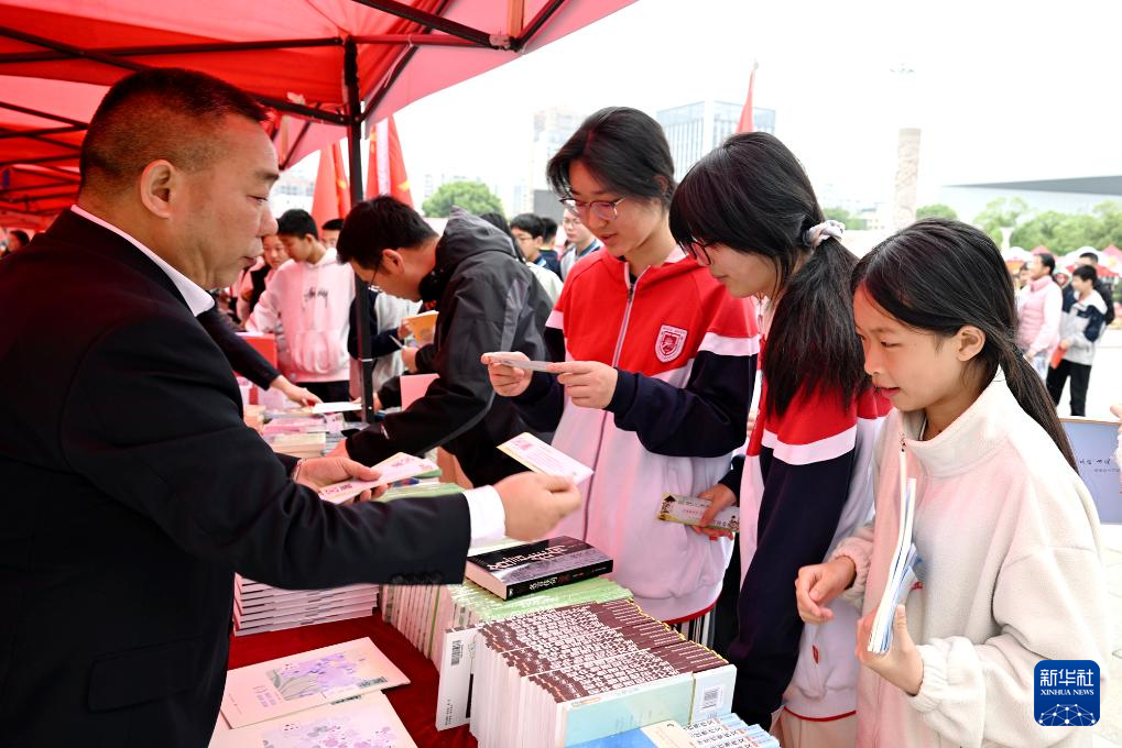 4月23日,湖北省咸宁市通城县银山广场举行的“深化全民阅读 共建书香通城”主题活动上,市民在领取惠民图书。