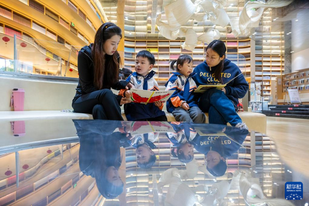 4月23日,在贵州省图书馆内,小朋友在家人的陪伴下读书。
