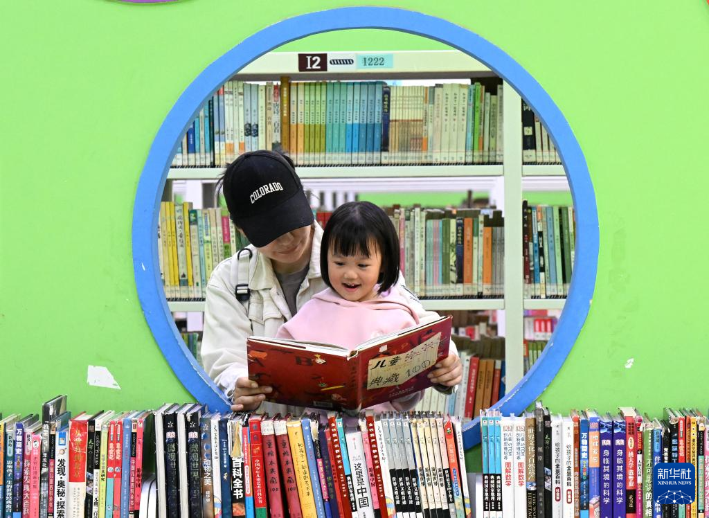 4月23日,小朋友和家长在河北省石家庄市图书馆少儿区阅读。