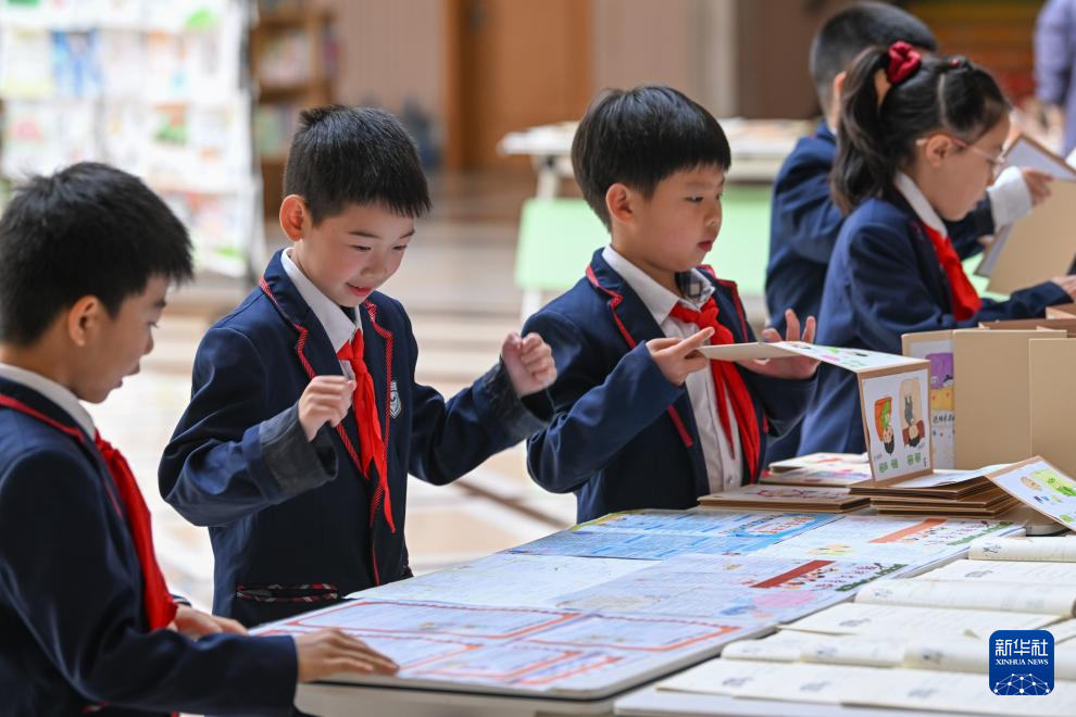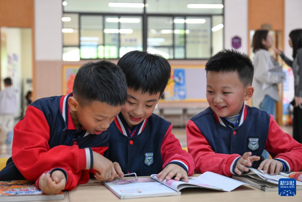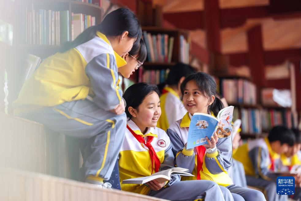 4月23日,在广西南宁市滨湖路小学教育集团滨湖校区,学校师生在阅读书籍。