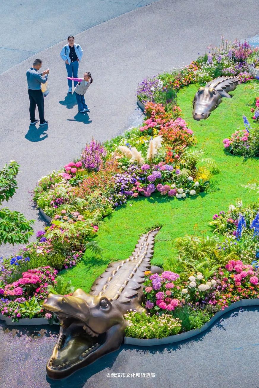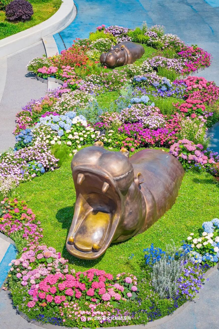 「武汉动物园」用花海打造了一座迷你湿地,景区大门外的小景可以免费打卡:河马、鳄鱼从绿藻中露出脑袋,怡然自得;大象在花丛里漫步,沾了一屁股花瓣;乌龟在岸上晒着背,优哉游哉……