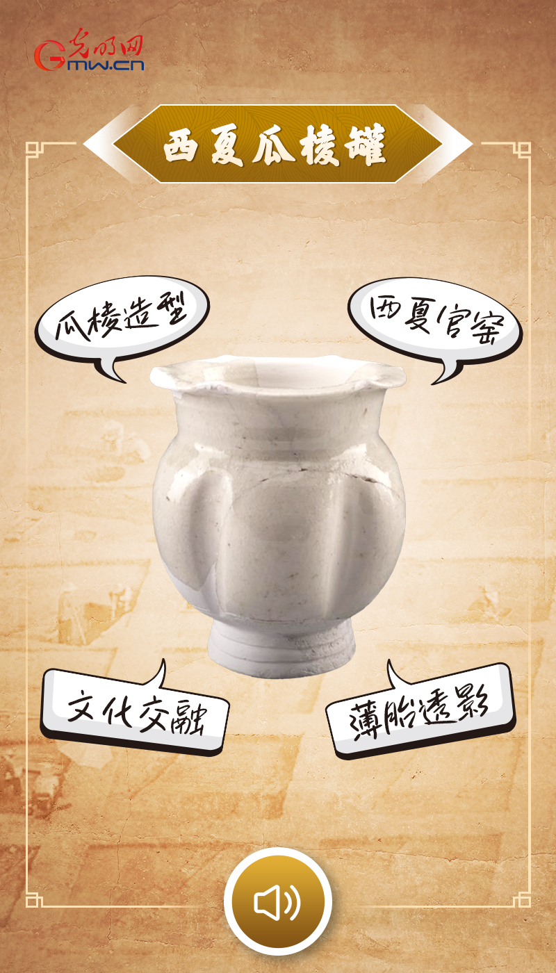 “我是出土于贺兰山苏峪口瓷窑址的瓜棱罐,由精细白瓷精工烧制,胎质坚致、釉色温润。器身竖向瓜棱造型,取瓜果之态、蕴吉祥之意,尽显宋代简约清雅的审美格调。我产自西夏官窑,既承袭西北瓷韵风骨,又吸纳江南制瓷技艺精华,兼具青白瓷的莹润通透与塞上大地的沉稳气度。我是民族文化交融的见证者,诉说着古匠巧思与南北瓷艺共生的传奇,承载着千年瓷韵与多民族文脉交融的珍贵印记。”